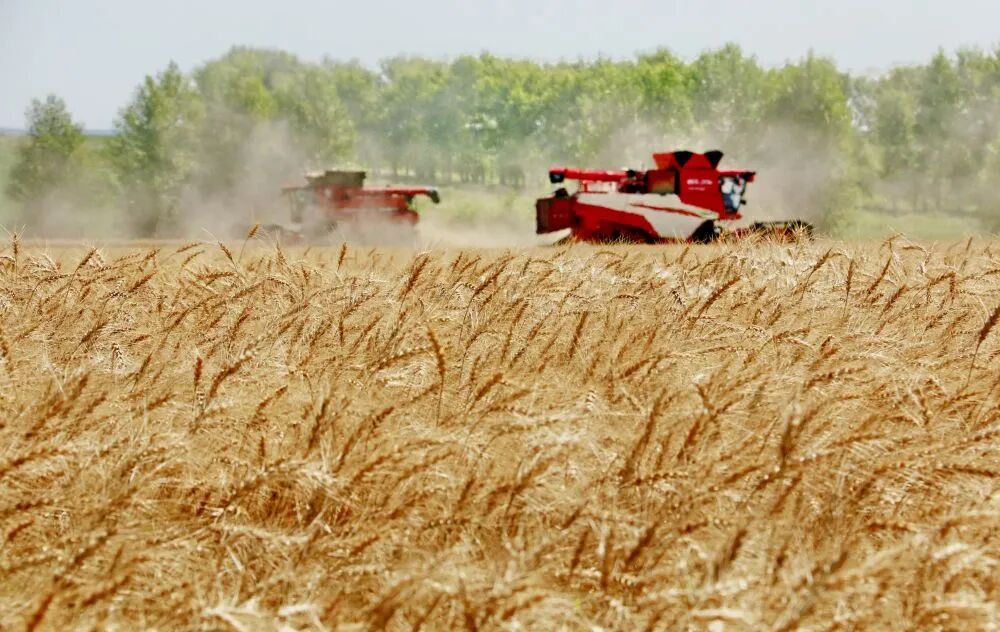 2025年8月5日,位于黑龙江省五大连池市的大庆油田农场调动多台联合收割机抢收小麦。新华社发(陆文祥 摄)