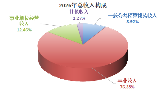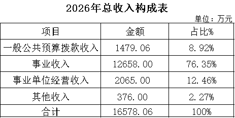 2026年收入预算16578.06万元,其中:一般公共预算拨款收入1479.06万元,占8.92%;事业收入12658.00万元,占76.35%;事业单位经营收入2065.00万元,占12.46%;其他收入376.00万元,占2.27%。