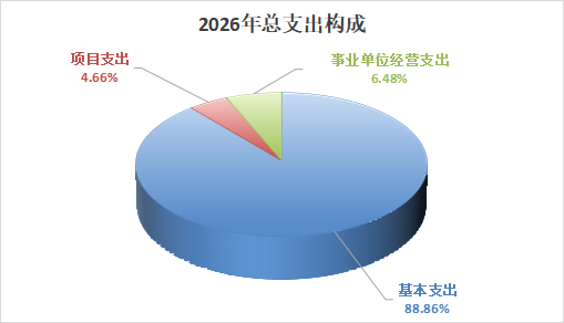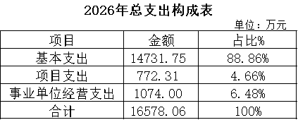 2026年支出预算16578.06万元,其中:基本支出14731.75万元,占88.86%;项目支出772.31万元,占4.66%;事业单位经营支出1074.00万元,占6.48%。