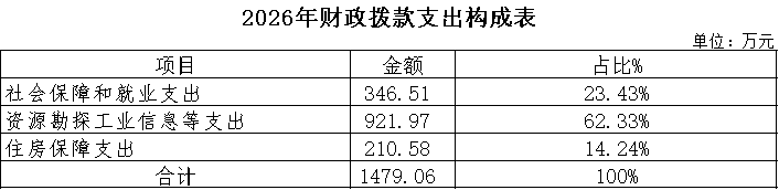 2026年财政拨款收支总预算1479.06万元。收入包括:一般公共预算拨款1479.06万元;支出包括:社会保障和就业支出346.51万元、资源勘探工业信息等支出921.97万元、住房保障支出210.58万元。
