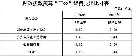 2026年“三公”经费支出1.43万元,为公务用车运行费。2025年“用车运行费”为1.43万元,保持持平。