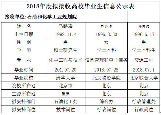 石油和化学工业规划院2018年度接收高校毕业生3名,现公示如下,如有异议,请以邮件方式与我单位和上级单位联系。公示时间为2018年8月27日至9月4日(7个工作日)。